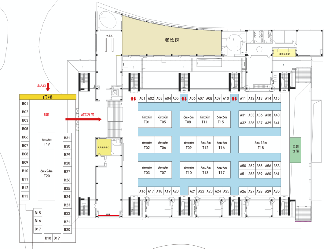 展区规划:展馆分为A、B两馆,由主入口进入后先经过B馆,再至A馆。展区分为原材料区、成品制品区、机械设备区及特色展示区。