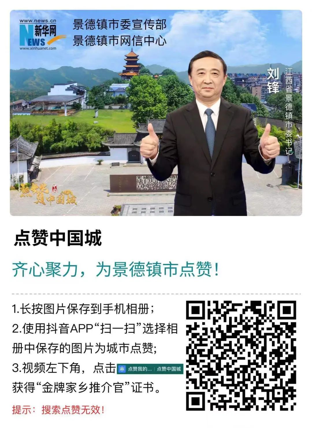 保存下方图片使用抖音APP扫描(搜索点赞无效)——点击视频参与助力——点击左下角“点赞我的家乡”进入投票入口——选择景德镇市所在县(市、区)立即点赞——点赞成功——领取金牌家乡推介官证书。