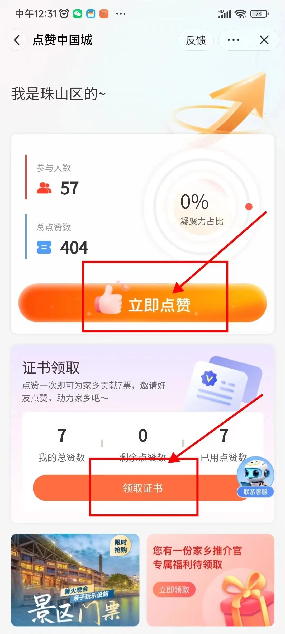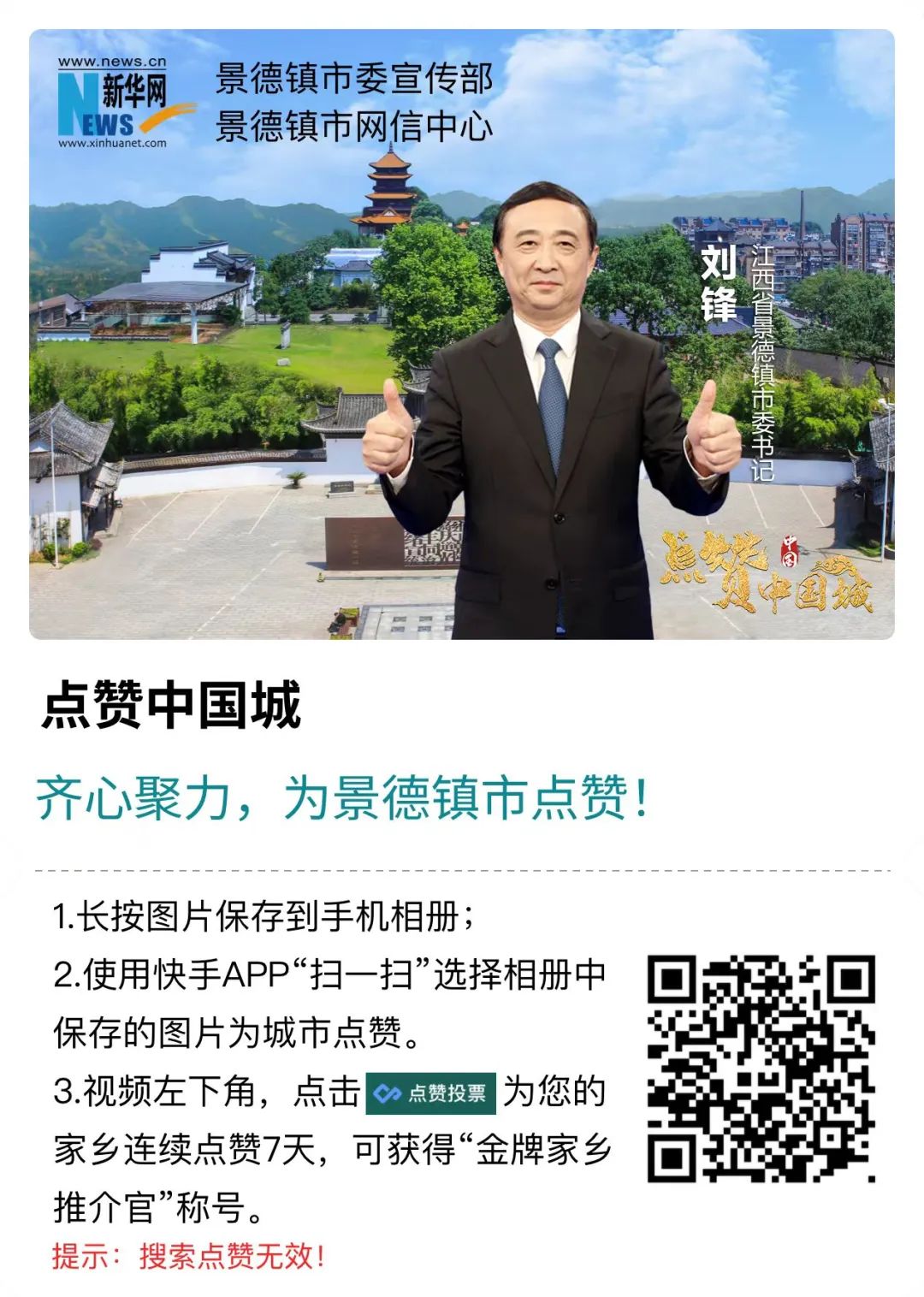 保存下方图片使用快手APP扫描(搜索点赞无效)——点击视频参与助力——点击左下角“点赞投票”进入投票入口——选择景德镇市所在县(市、区)立即点赞——领取家乡推介官证书。
